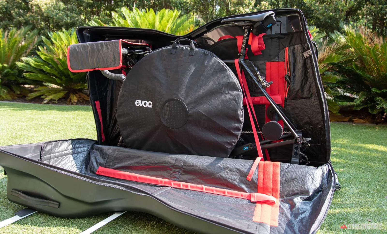The hire cost includes the EVOC Road Bike Bag PRO and all its internal parts, including the bike stand, padding, and wheel bags.